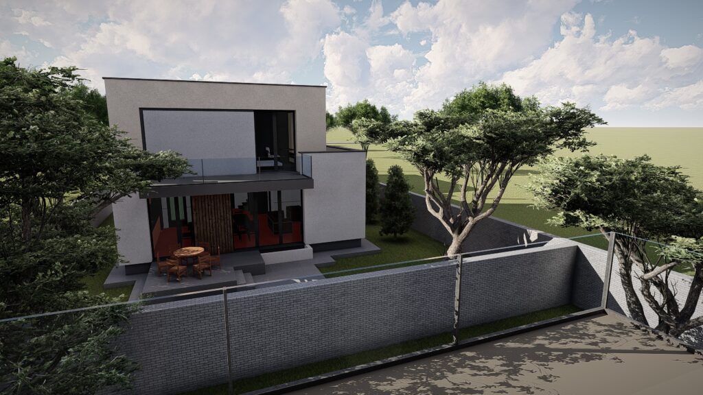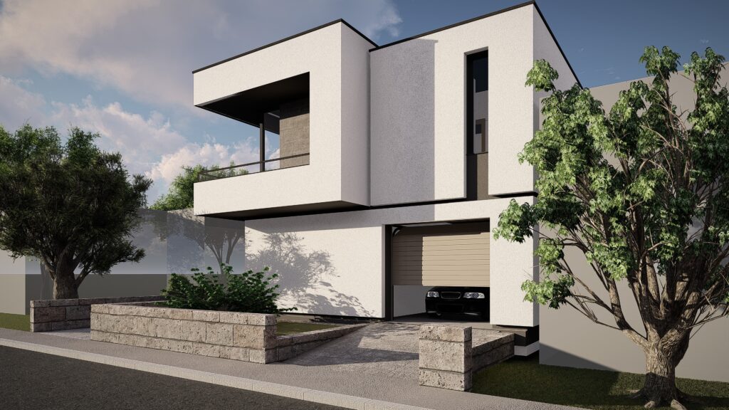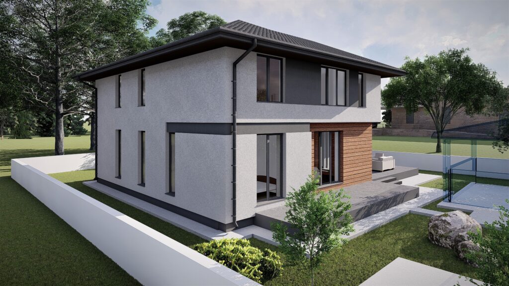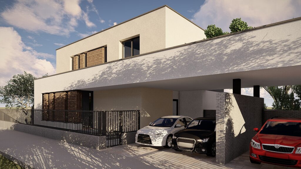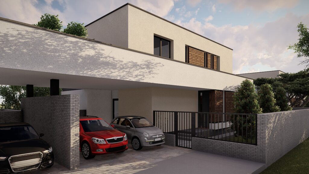 Fiecare locuinta se desfasoara pe o suprafata utila de 164 mp si este distribuita la nivelul parterului cu zona de zi compusa din living, loc de luat masa si bucatarie, camara, dormitor de oaspeti, camera tehnica, grup sanitar si hol. La nivelul etajului se dispune zona de noapte compusa din 3 dormitoare cu dressing, 2 bai si hol.