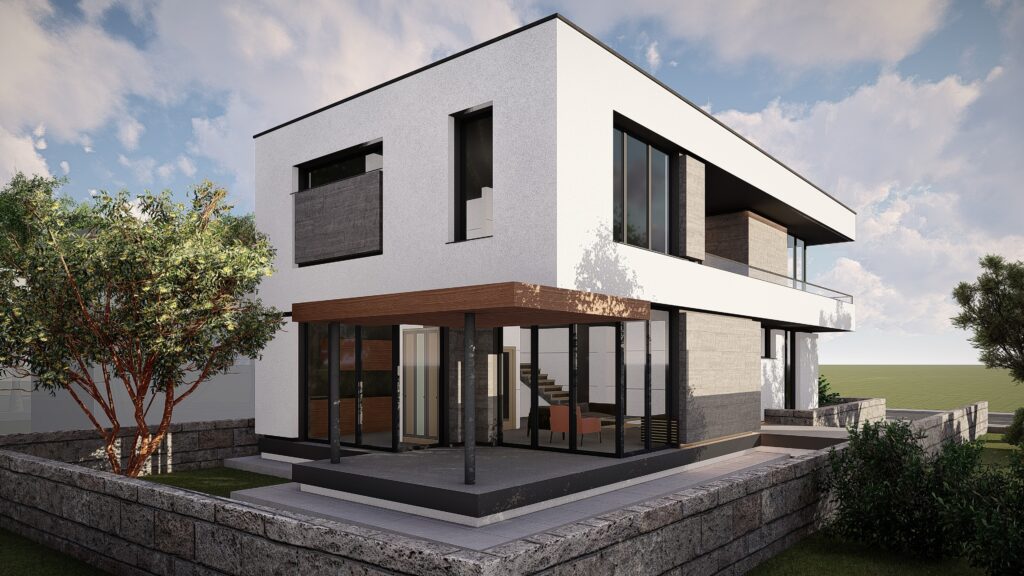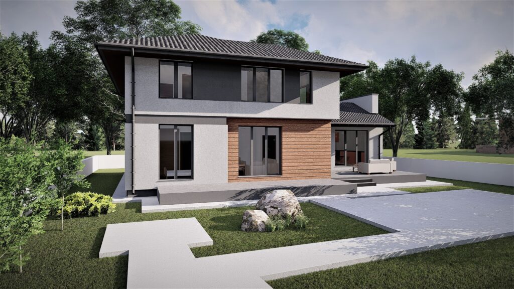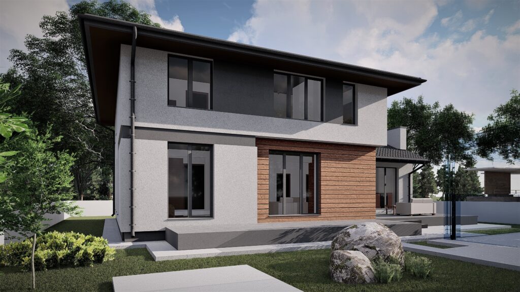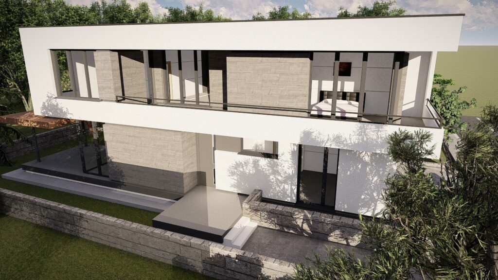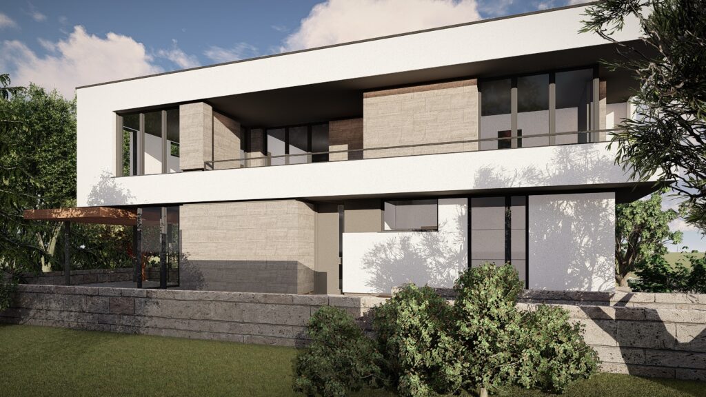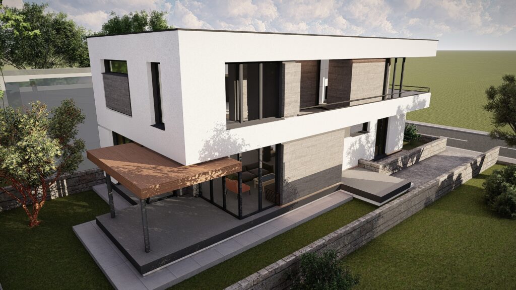 Fiecare locuinta se desfasoara pe o suprafata utila de 164 mp si este distribuita la nivelul parterului cu zona de zi compusa din living, loc de luat masa si bucatarie, camara, dormitor de oaspeti, camera tehnica, grup sanitar si hol. La nivelul etajului se dispune zona de noapte compusa din 3 dormitoare cu dressing, 2 bai si hol.